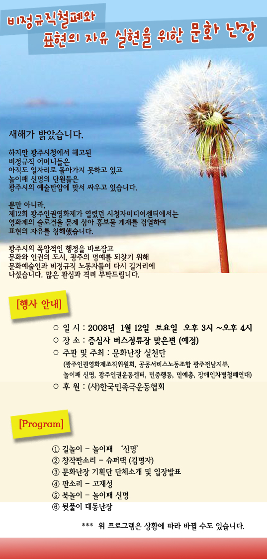 | 966 | 비정규직철폐와 표현의자유 실현을 위한 문화난장 | 민중행동 | 2008.01.11 | 6184 |