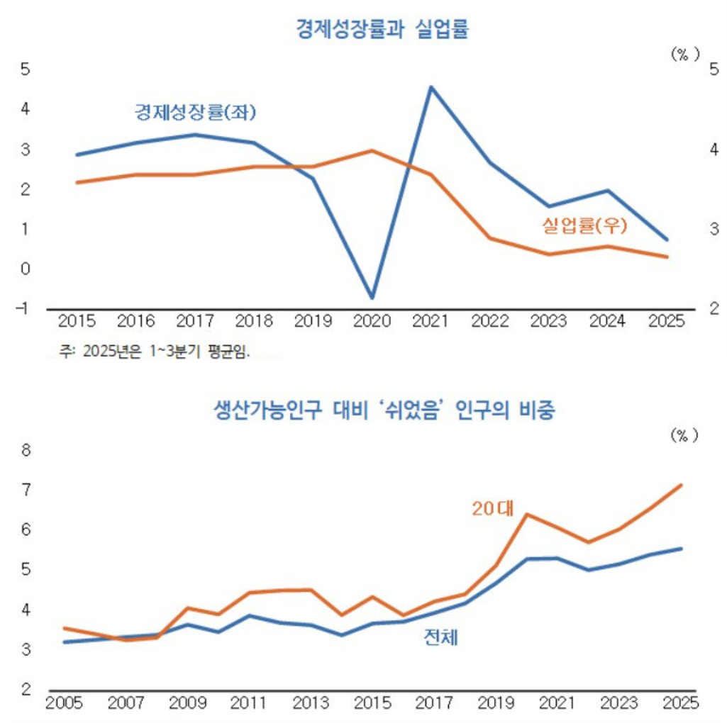 위 그래프에서 볼 수 있듯, 코로나19 위기 이전 3%대 중후반에 이르렀던 실업률은 2021년 들어 빠르게 하락한 후 2%대 중후반의 낮은 수준을 이어가고 있다. 특히 2021년 이후 경제성장률이 둔화되기 시작하였음에도 불구하고 실업률은 여전히 낮은 수준을 지속하고 있다는 점에서 한국 노동시장에 구조적 변화가 발생했을 가능성을 시사한다. 아래 그래프에서 볼 수 있듯, 2005년 당시 15세 이상 생산가능인구의 3.2%(123만 명) 수준이었던 ‘쉬었음’ 인구는 2015년 이후 증가세가 크게 확대되어 2025년에는 생산가능인구의 5.6%(254만 명)가 ‘쉬었음’ 상태에 있는 것으로 나타난다. (자료출처: 김지연, 「최근 낮은 실업률의 원인과 시사점」, 《KDI 현안분석》, 2025년 11월 6일.)