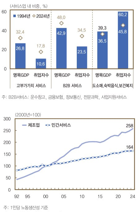 한국의 서비스업은 오랫동안 제조업의 보조적이고 파생적인 기능에 종속되었다. 실제로 서비스업 총산출의 32%가 제조업 수출과 직간접적으로 연계되어 있어 독립적인 사업적 축적이 이루어지기 어려웠다. 더불어 서비스업은 사회적으로도 공공재, 규제 대상으로 취급되어 민간투자와 혁신 기반이 취약했다. 민간 서비스업 투자율은 2000년 26%에서 2022년 18%로 하락하였으며, 서비스 기업의 시가총액은 제조업의 절반 수준에 머물고 있다.