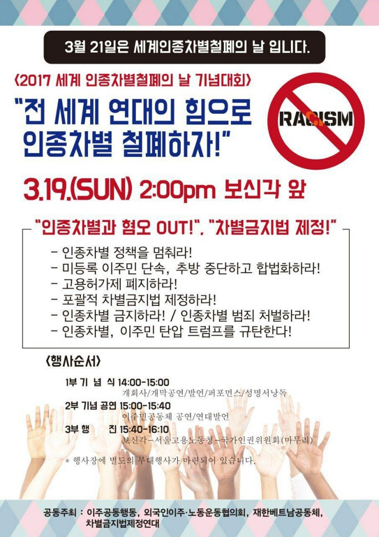 | 900 | 공지3.19 세계 인종차별 철폐의 날 집회 안내 | 사회진보연대 | 2017.03.14 | 32426 |