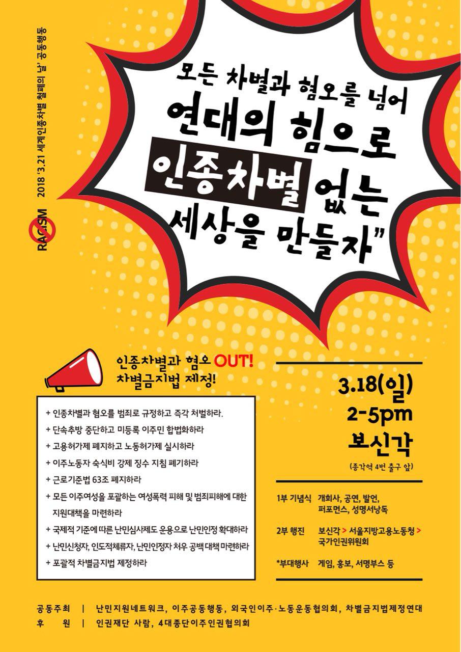 | 1134 | 공지3.18 세계 인종차별 철폐의날 대회 | 사회진보연대 | 2018.03.16 | 39166 |