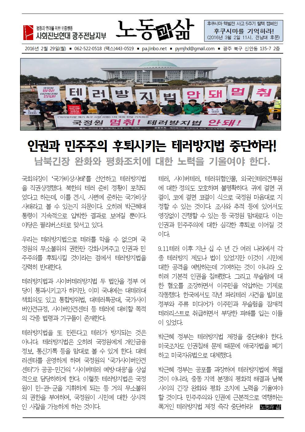 "국정원 권한만 강화, 인권과 민주주의 후퇴 폭거 테러방지법 반대한다!"