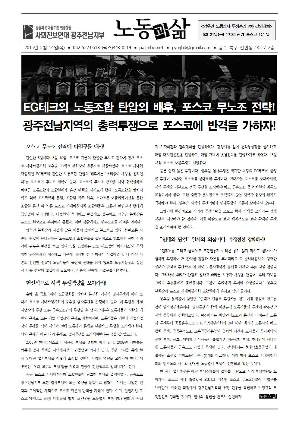 EG테크의 노동조합 탄압의 배후, 포스코 무노조 전략! 광주전남지역의 총력투쟁으로 포스코에 반격을 가하자!