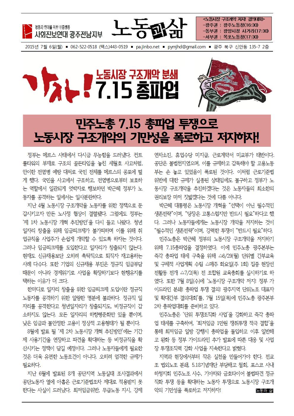 민주노총은 박근혜 정부의 노동시장 구조개악을 저지하기 위해 7.15총파업을 결정하였다. 이에 민주노총 광주본부는 즉각 총파업 태세 구축을 위해 △6/29(월) 단위별 간부교육 및 구체적 사업계획 수립 △매주 화요일(주 1회) 집중 현장선전활동 전개 △7/2(목) 전 조합원 교육총회를 실시하기로 하였다. 또한 7월 8일(수)에 ‘노동시장 구조개악 저지! 정부 가이드라인 분쇄! 총파업 투쟁 결의! 광주지역 단위노조 대표자 및 확대간부 결의대회’를, 7월 15일(목)에 민주노총 광주본부 2차 총파업대회를 준비하고 있다.