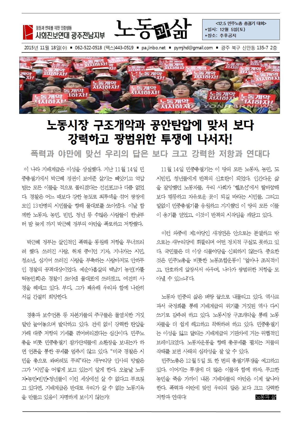 11월 14일 민중총궐기는 이 땅의 모든 노동자, 농민, 도시빈민, 청년들에게 반격의 신호탄이 되었다. 인간다운 삶을 갈망했던 노동자들, 우리 사회가 ‘헬조선’에서 탈바꿈해 보다 평등하고 자유로운 곳이 되길 바라는 시민들, 그리고 말없이 민중총궐기를 응원하고 지지했던 이 땅의 모든 이들이 용기를 얻었고, 이것이 반격의 시작임을 깨닫고 있다.