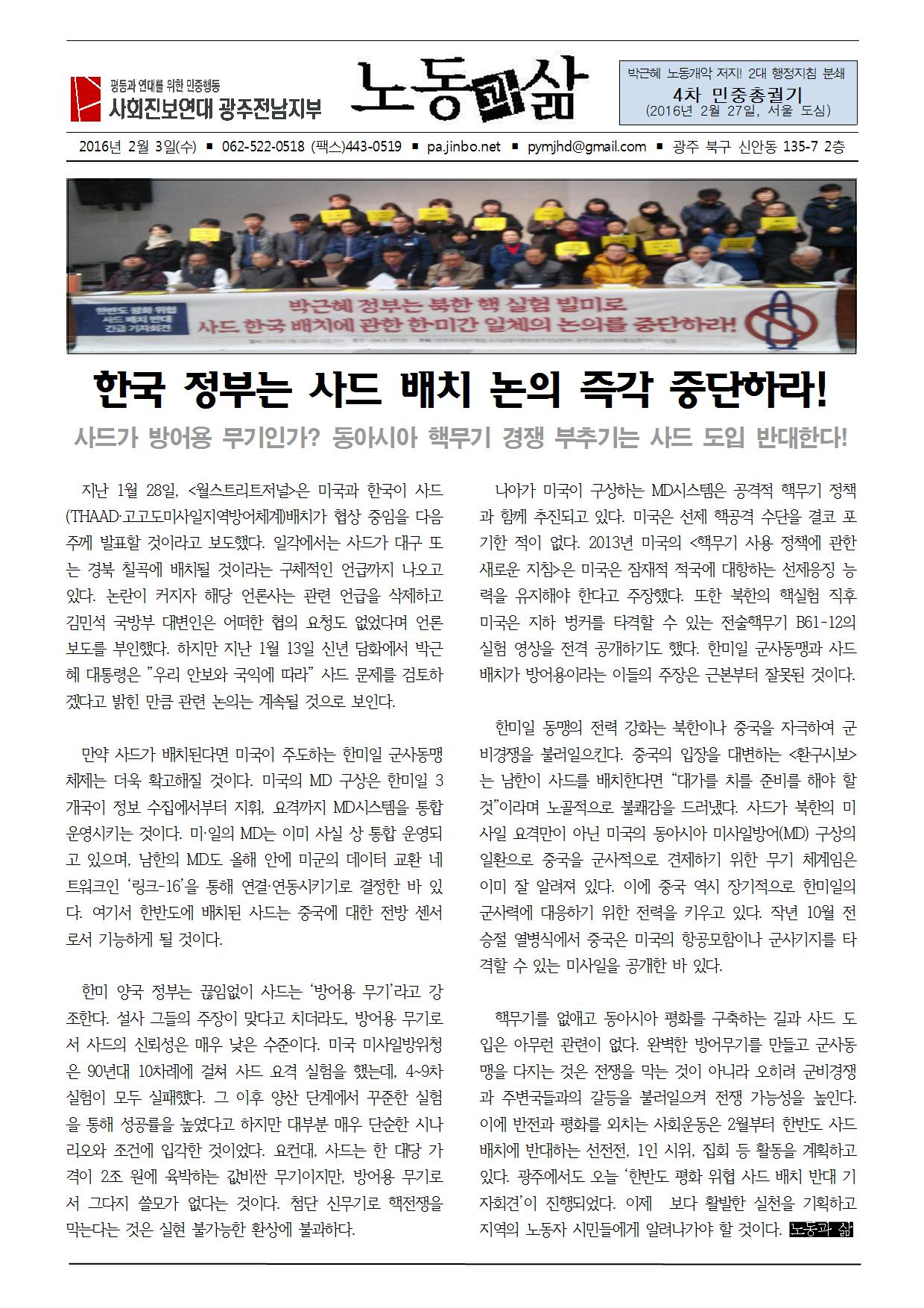 핵무기를 없애고 동아시아 평화를 구축하는 길과 사드 도입은 아무런 관련이 없다. 완벽한 방어무기를 만들고 군사동맹을 다지는 것은 전쟁을 막는 것이 아니라 오히려 군비경쟁과 주변국들과의 갈등을 불러일으켜 전쟁 가능성을 높인다. 이에 반전과 평화를 외치는 사회운동은 2월부터 한반도 사드 배치에 반대하는 선전전, 1인 시위, 집회 등 활동을 계획하고 있다. 광주에서도 오늘 ‘한반도 평화 위협 사드 배치 반대 기자회견’이 진행되었다. 이제 보다 활발한 실천을 기획하고 지역의 노동자 시민들에게 알려나가야 할 것이다.