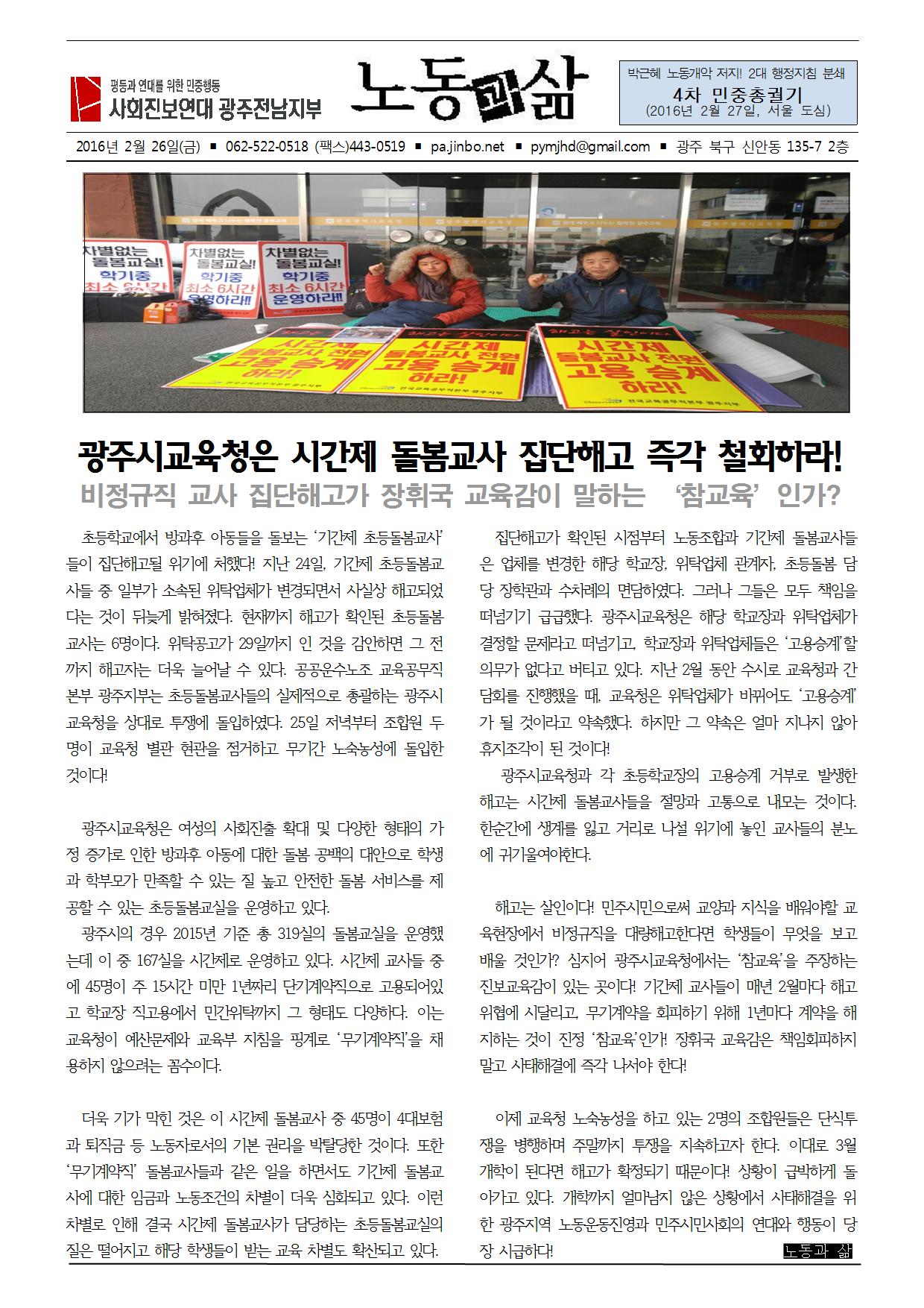 해고는 살인이다! 민주시민으로써 교양과 지식을 배워야할 교육현장에서 비정규직을 대량해고한다면 학생들이 무엇을 보고 배울 것인가? 심지어 광주시교육청에서는 ‘참교육’을 주장하는 진보교육감이 있는 곳이다! 기간제 교사들이 매년 2월마다 해고위협에 시달리고, 무기계약을 회피하기 위해 1년마다 계약을 해지하는 것이 진정 ‘참교육’인가! 장휘국 교육감은 책임회피하지 말고 사태해결에 즉각 나서야 한다!
