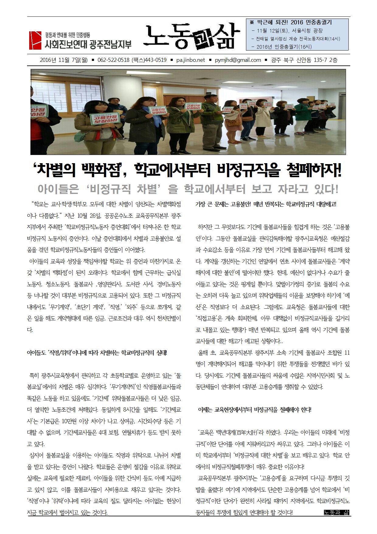 올해 초, 교육공무직본부 광주지부 소속 기간제 돌봄교사 조합원 11명이 계약해지되어 해고를 막아내기 위한 투쟁들을 전개했던 바가 있다. 당시에도 기간제 돌봄교사들의 싸움에 수많은 지역시민사회 및 노동단체들이 연대하여 대부분 고용승계를 쟁취할 수 있었다.