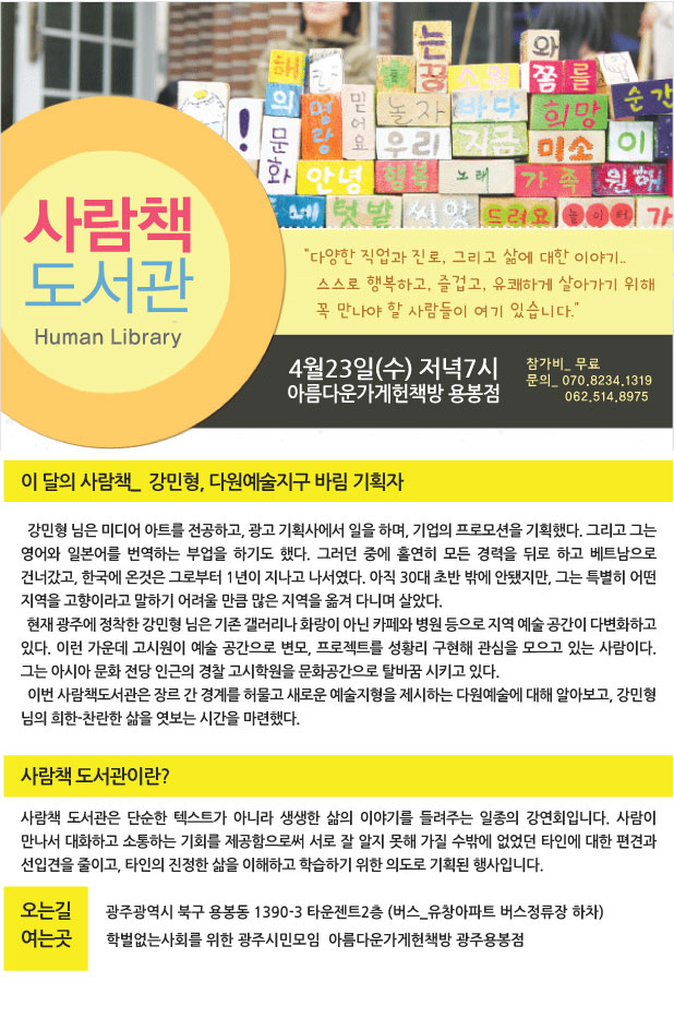 사람책 강연회 참가안내 <강민형, 다원예술지구 바림 기획자의 이야기>