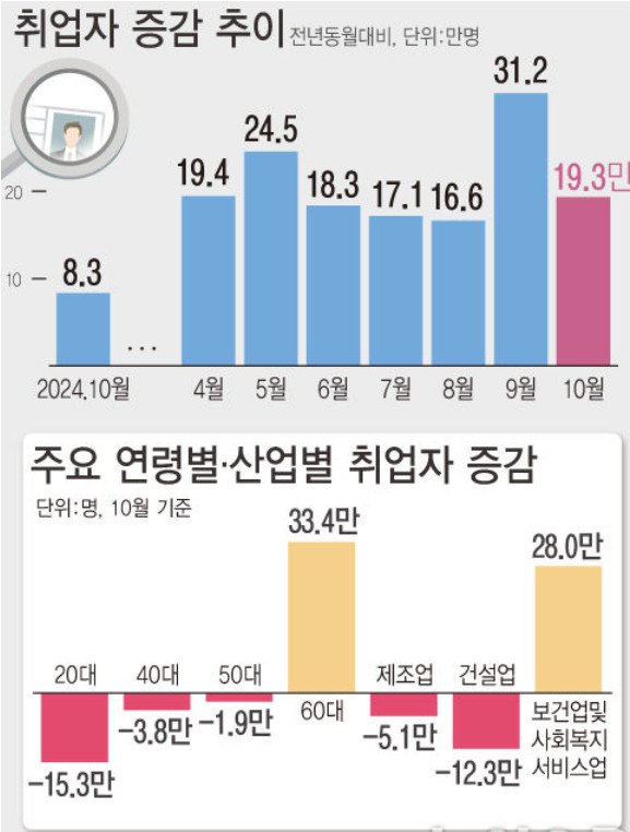 취업자 증감 전체 추이와 연령별, 산업별 추이 (자료출처: 《뉴시스》)