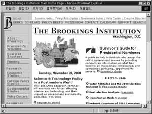 1988년 11월 부시와 듀카키스간의 대통령 선거에서는 매우 특이한 양상이 포착된다. 레이건의 당선 이후, 정치적·이념적 지향의 차이로 인해 상대적으로 소외된 연구소들이 집단적으로 움직인 것이다. 특히, 브루킹스 연구소는 <1988년으로 가는 길>이라는 정책입안팀을 발족하여 듀카키스와 민주당을 노골적으로 지원하였고 "이번 대통령 선거는 후보자의 사상이 아니라 정책이 이슈가 되어야 한다"는 모토를 앞세워 미국 국민들을 직접 설득하였다. 1980년 대통령선거에서 레이건 돌풍의 주역이었던 헤리티지 연구소는 자신의 이념적 지향에 따라 응당 부시와 공화당을 지원하였다. 이들은 "급진진보 세력의 듀카키스가 탈을 쓰고 국민들을 우롱하고 있다"고 화답하며 후보자의 사상이 쟁점임을 재확인한 것이다. 대통령 선거가 브루킹스와 헤리티지, 두 연구소의 대리전 양상은 아닌가하는 인상마저 드는 대목이다.