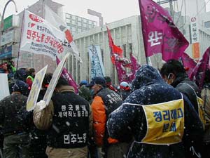 처음 방송을 잡은 것은 투쟁팀 대오를 이끌고 있는 한통계약직 팀장이었지만, 새벽잠을 설치고 4시간동안 달려온 탓에 여독이 풀리지 않은 듯 힘있는 한통비정규노동자의 모습을 보여주지는 못했다. 필자는 대오에서 뛰쳐나와 마이크를 잡고 거침없이 토해내기 시작했다. 비정규직 양산하는 김대중정권 퇴진하라! 비정규직 완전철폐 정규직화 쟁취하자!