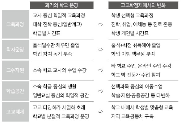 고교학점제는 교육과정의 다양화를 통해 학생 스스로 진로와 적성을 찾을 수 있도록 한다는 취지로 도입되었다. 그러나 고교학점제가 거창한 설명과 같은 기능을 수행할 수 있을지에 대해 많은 쟁점이 존재한다. 우선 진로탐색 중심으로 교육이 설계되는 것이 적절한가의 문제다. 만약 직업교육이 필요하다면 직업계열 학교를 내실화하는 것이 더 적절할 것이다. 두 번째로 학습에 무기력한 학생들을 위한 실질적 대책이 될 수 있는가에 관한 쟁점이다. 이는 다층적인 원인이 중첩된 것으로, 오히려 단기적으로는 수업의 질을 높이는 것이 효과적인 대책이 될 수 있다. 끝으로 선택과목의 다양화가 민주시민의 자질을 함양하는 적절한 방안인가에 관한 것이다. 수학, 자연과학, 역사 등 어렵지만 반드시 배워야할 과목에 대해 효과적인 교육방법을 고민하는 대신, 학생에게 교육받지 않을 기회를 주는 것은 대안이 될 수 없다는 지적이다. (표 출처: 교육부 보도자료)