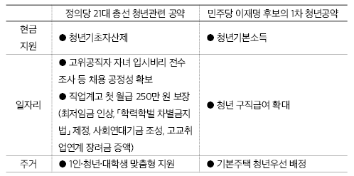 아래의 표는 2020년 21대 총선에서 정의당이 제시한 청년 공약과 민주당 이재명 예비후보가 2021년 8월 5일 발표한 1차 청년공약을 비교한 것이다. (정의당의 청년 공약은 문재인 정부의 청년정책 기본계획 발표 이전에 제시된 것인데, 일부는 문재인 정부의 정책에도 반영되었다.) 언뜻 보기에는 두 정당의 공약이 조금씩 달라 보일 수 있겠지만, 조금만 살펴본다면 많은 부분에서 일치한다는 점을 알 수 있다.