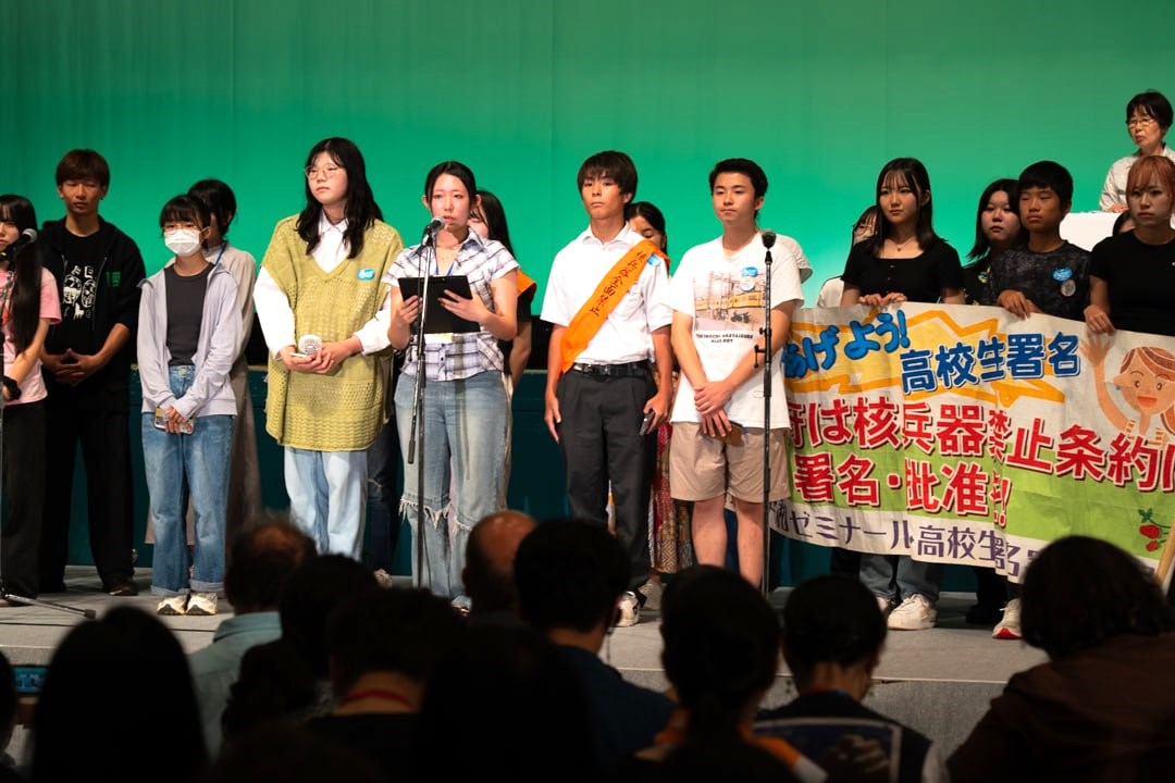 8월 9일 나가사키 원폭 투하 80주년 집회 무대에 서서, <일본 정부의 핵무기금지조약 가입을 요구하는 고교생 서명운동>의 현황을 보고하는 일본 고등학생들. 이들뿐만 아니라 세계대회 기간 동안 만난 일본 청년들은 “피폭자의 기억을 후대에 이어가는 것이 우리의 책무”라는 마음가짐을 계속해서 밝혔다.