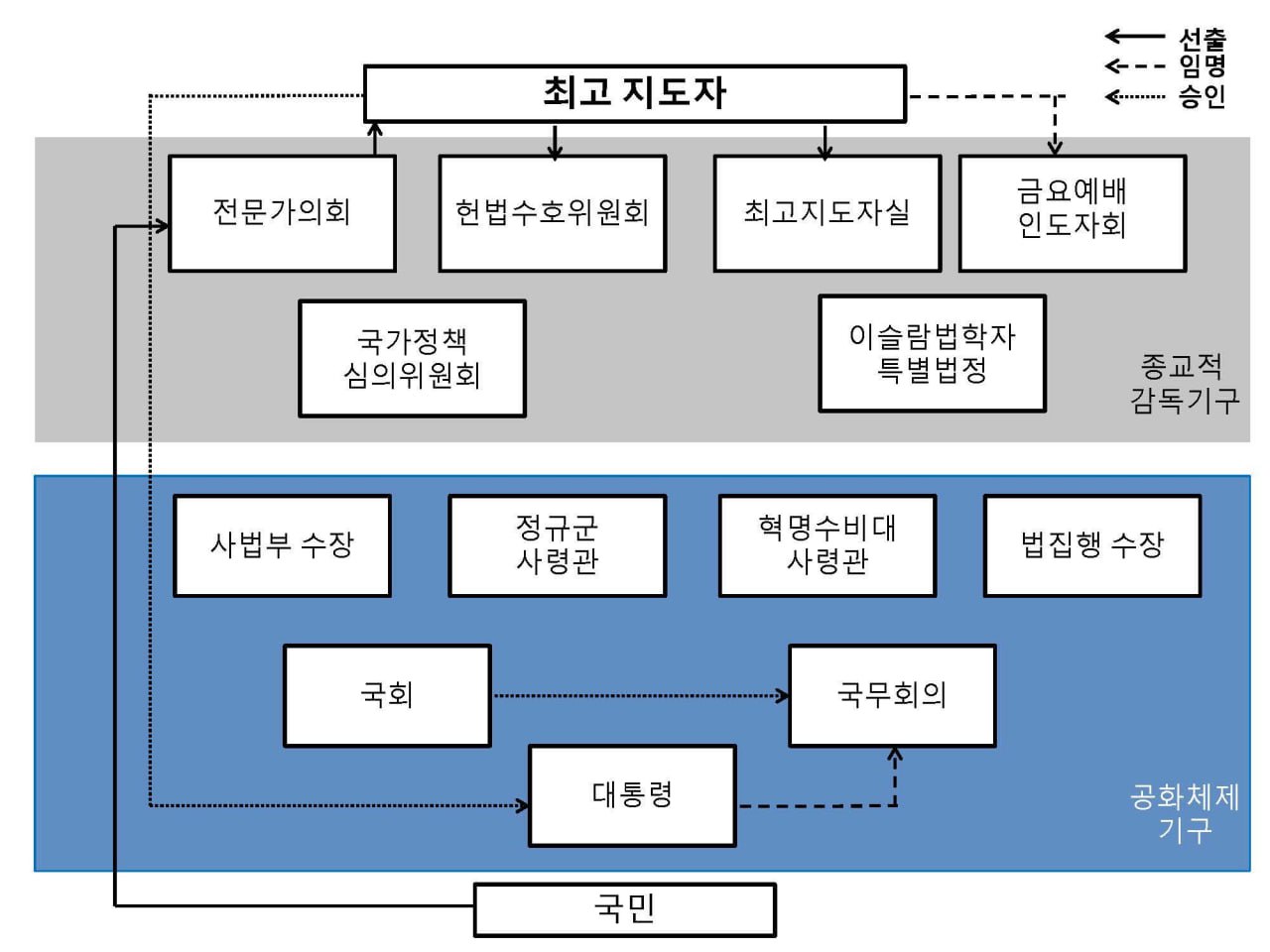 이란 이슬람 공화국은 신정체제와 공화국체제로 구성된다. 여기서 공화국체제는 신정체제의 하부구조다. 행정부와 입법부 모두 이슬람법을 해석하고 적용하는 이슬람법학자들의 통제를 받기 때문이다. 최고지도자는 헌법수호위원회, 혁명수비대 사령관, 사법부 수장을 임명해 이란 사회 전 분야를 이끌고 있다. 최고지도자는 임기의 제한이 없다. (출처: 대외경제정책연구원, 「이란의 정치 권력구조와 주요 정파별 경제정책」, 전략지역심층연구, 2012)