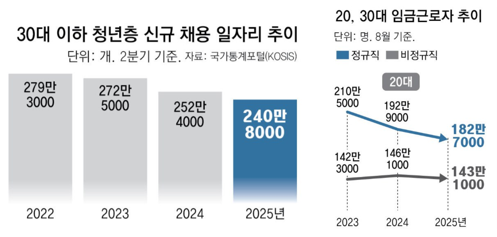 오른쪽 20대 임금근로자 추이에서 위쪽 그래프가 정규직, 아래쪽 그래프가 비정규직을 나타낸다. 전체적으로 청년층 신규 채용 일자리 수가 감소하는 가운데, 특히 청년층 정규직 수가 급감하고 있음을 볼 수 있다. (자료출처: 《동아일보》)