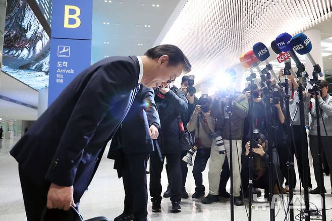 2025년 12월 11일, UN해양총회 유치를 위해 출국했다 귀국한 전재수 해양수산부장관이 인천공항에 모인 취재진 앞에서 ‘통일교 금품 수수 의혹’에 “장관직을 내놓고 당당히 응하겠다”며 사퇴를 선언했다. 관련 수사가 아직 진행 중으로 의혹의 진위 여부는 밝혀지지 않았지만, 이재명 정부 내각의 첫 낙마이자 가장 유력한 민주당 부산시장 후보의 장관 사퇴 자체의 충격이 컸다. (사진출처: 《뉴시스》)
