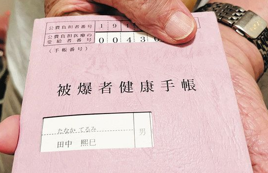 1957년 원폭의료법 시행 이후 일본 정부는 피폭자 건강수첩(원폭 수첩)을 소지한 피폭자만을 지원의 대상으로 삼았다. 이 때문에 수첩은 일본 정부가 설정한 수첩 취득 기준을 충족하지 않는 피폭자나 재외국민 피폭자의 투쟁 목표가 되었다. 수첩에는 피폭자의 인적사항과 피폭 위치 등이 쓰여 있다. 사진은 다나카 테루미 피단협 대표위원의 피폭자 건강수첩이다. [사진출처: 《도쿄신문》]