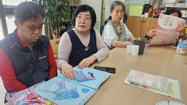 한정순 한국원폭2세환우회 회장(왼쪽 두 번째)이 ‘원폭2세 환우 쉼터’인 합천평화의집에서 환우회원들의 그림 그리기 활동을 돌보고 있다. 2025년까지 한정순 회장은 대퇴부 무혈성 괴사증으로 다리 수술을 6차례 받았고, 그 외 수술까지 총 12번의 수술을 받았다. 첫째 아들은 중증 뇌성마비 장애를 갖고 태어났다. 2003년 김형률 당시 환우회 회장을 만나 자신과 아들의 고통이 원폭후유증 때문인 것과, 자신 외에도 김형률과 같이 힘든 피폭 2세가 많다는 사실을 알게 되어 운동에 함께하게 되었다. [사진출처: 《경남도민일보》]