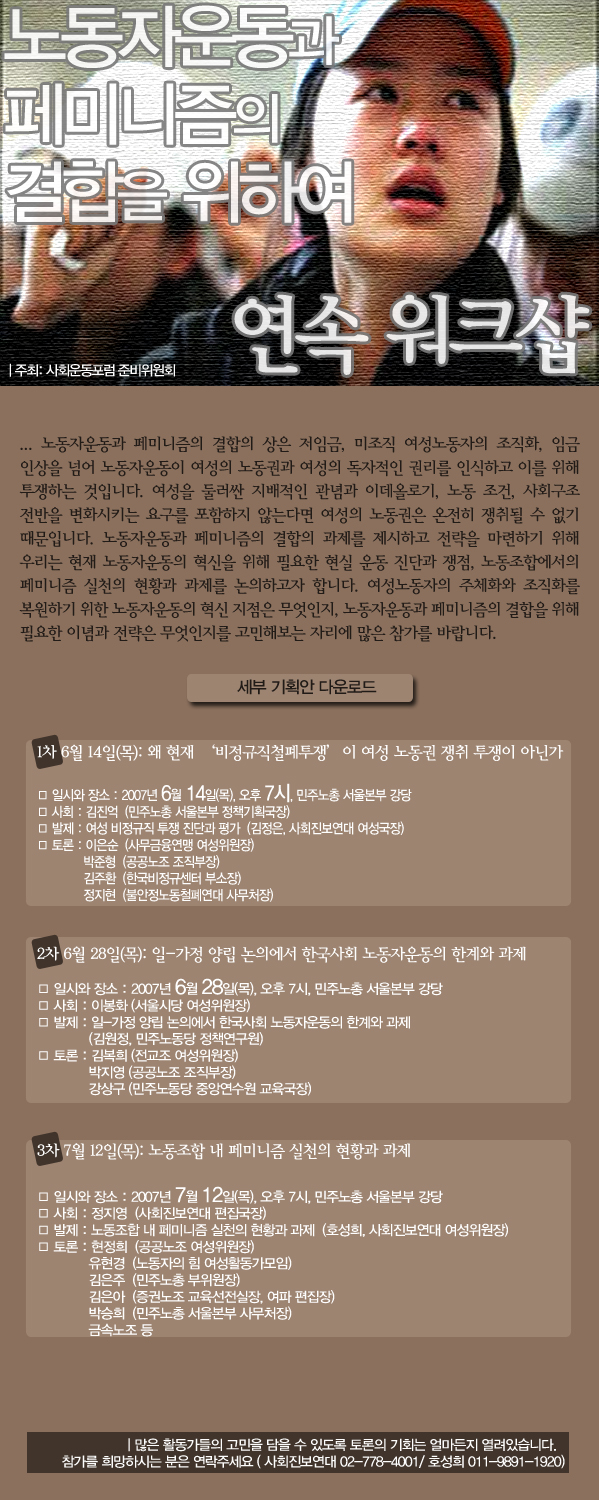 | 1171 | 노동자 운동과 페미니즘의 결합을 위하여_웹자보 | 사회운동포럼 준비위원회 | 2007.06.04 | 42352 |