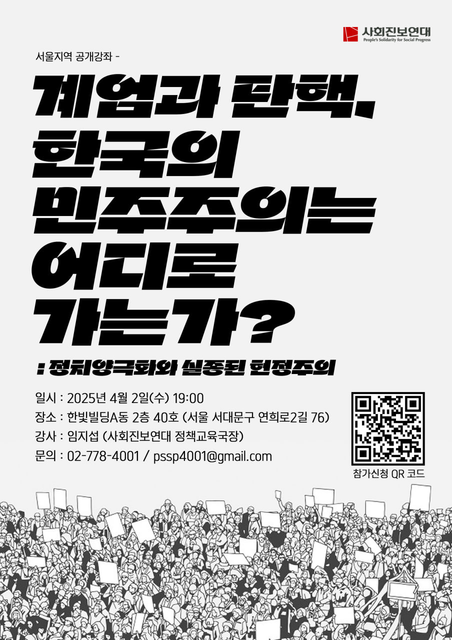 | 2155 | [서울지역 공개강좌] 계엄과 탄핵, 한국의 민주주의는 어디로 가는가? : 정치양극화와 실종된 헌정.. | 사회진보연대 | 2025.04.09 | 12716 |