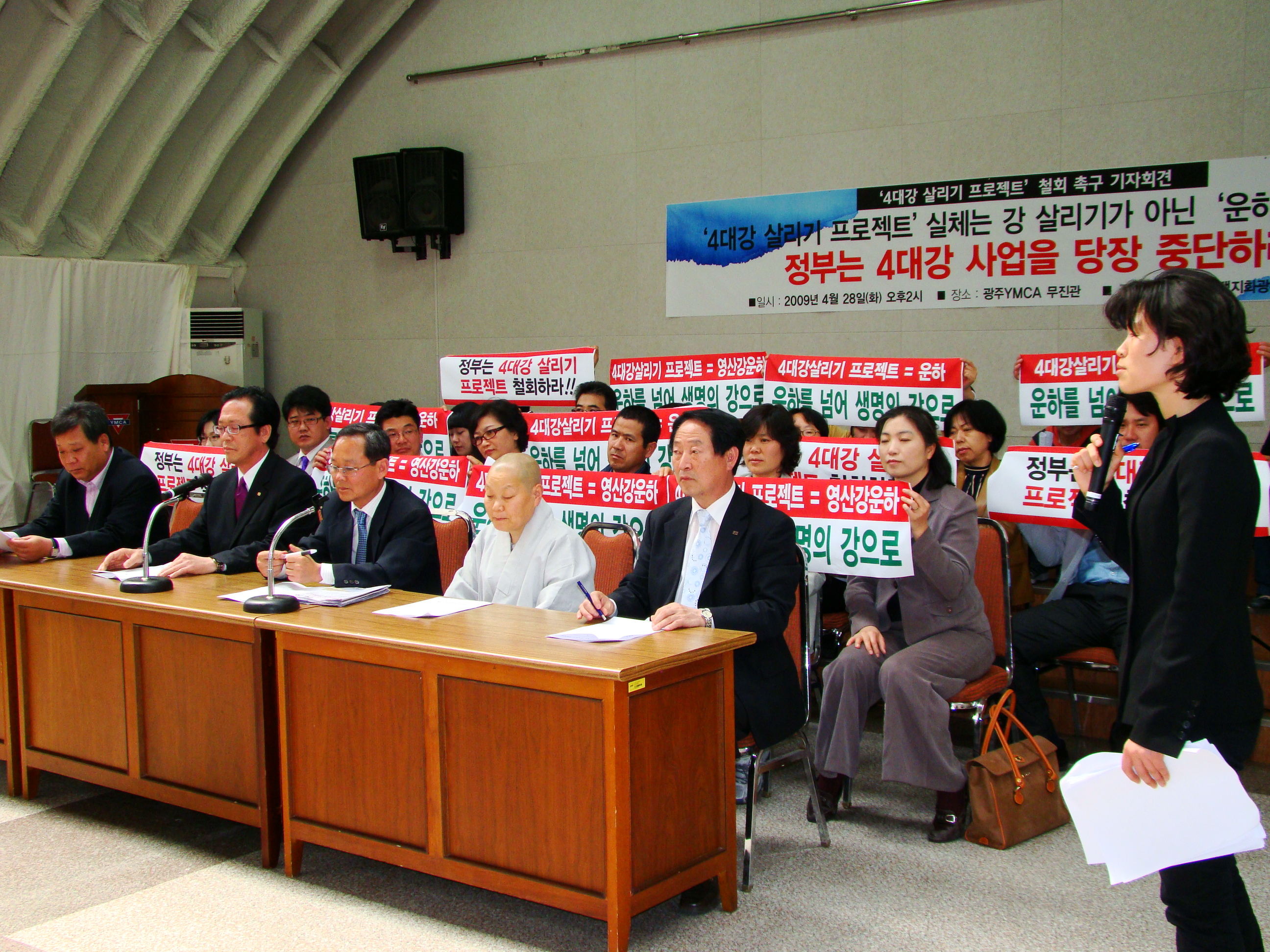 이어 " 4대 강 살리기 내용은 하도준설, 제방제고, 보 설치 등 본류 중심의 대대적인 토목 사업"으로 "홍수와 가뭄에 대한 대비는 커녕 하천 생태계가 더 악화시키것"이라며 정부의 4대 강 살리기 사업 철회를 촉구했다.