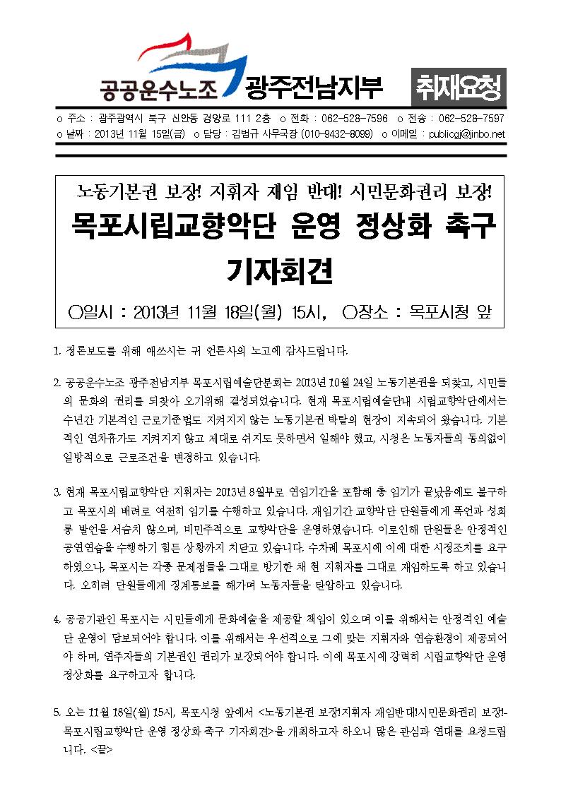 11월18일(월) 목포시립교향악단 운영정상화 촉구 기자회견