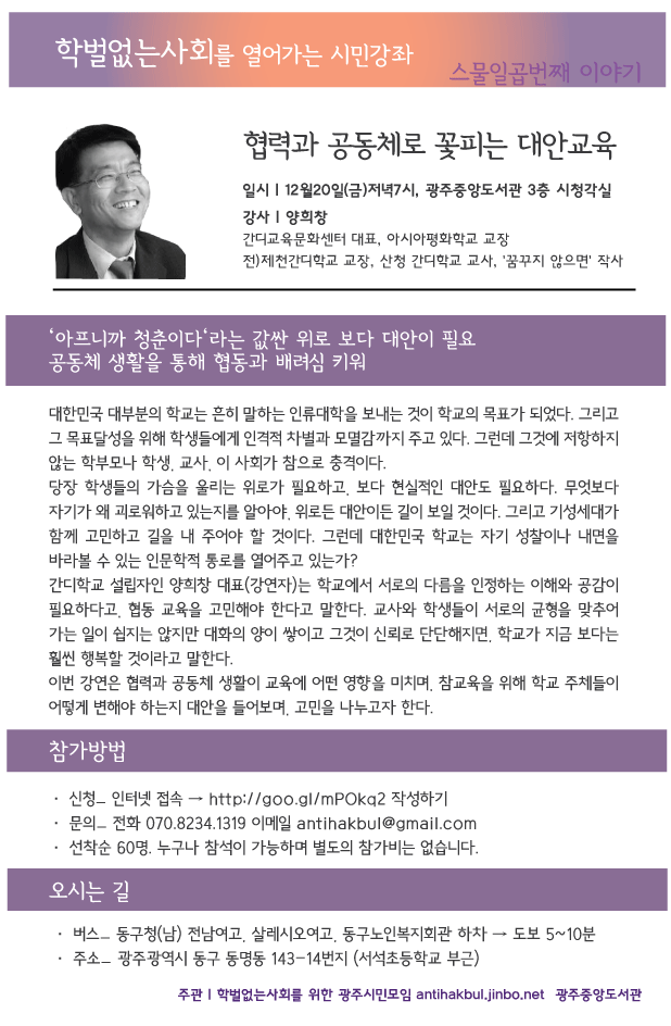 양희창 전)간디학교 교장 강연회 참가안내_협력과 공동체로 꽃피는 대안교육