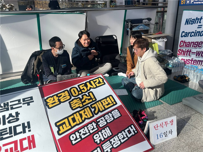 그러나 파업투쟁 이후 진행된 2주간의 집중교섭이 결렬되면서, 10월 27일부터 인천공항지역지부 지도부 3인(정안석 지부장, 박대성 보안통합지회장, 이자형 설비지회장)은 단식투쟁에 들어갔다. 공사의 철저한 무반응 속에서 11월 5일 단식 10일차 정안석 지부장이 심한 복통으로 병원에 이송되기도 했다. 박대성 보안통합지회장과 이자형 설비지회장이 단식 16일째를 맞은 11월 11일, 인천공항 단식농성장을 찾았다. 단식농성장은 제1터미널 3층 한 켠에 자리하고 있었다. 오고가는 공항 이용객, 응원하러 온 조합원‧시민들로 분주한 가운데 이진호 인천지부 사무처장, 서단비 광주전남지부 정책국장이 정안석 지부장을 만나 인터뷰를 진행했다.