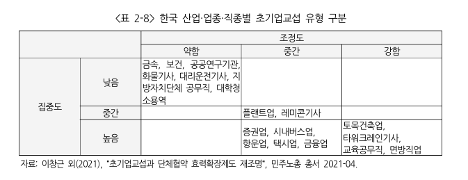 첫째 발제자로 나선 이창근 민주노동연구원 연구위원은 한국 산별노조의 역사적 궤적과 특징을 정리하며 그 시사점을 제시했다. 이창근 연구위원은 한국 초기업교섭의 유형을 단체교섭 ‘집중도’와 ‘조정도’를 기준으로 네 가지로 유형화했다. 이는 한국에서 초기업교섭이 다양한 유형으로 나타나며 서로 불균등하게 발전하고 있음을 보여준다.