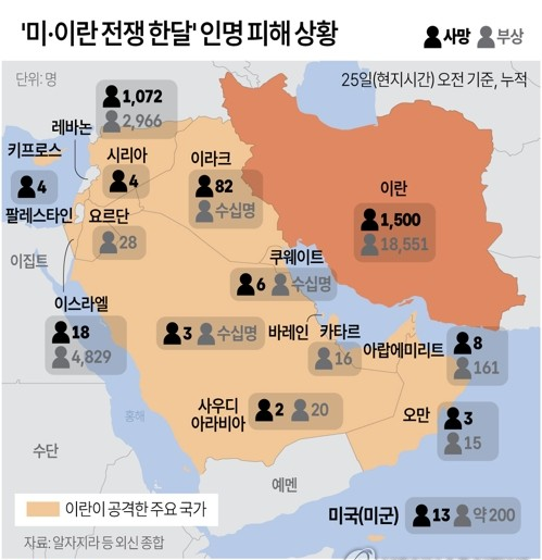 2026년 2월 28일, 미국과 이스라엘이 ‘장대한 분노(Epic Fury)’ 작전을 통해 이란 테헤란을 공습해 이란 최고지도자 알리 하메네이를 비롯한 지도부 다수가 사망했고, 이에 이란이 반격하면서 전쟁이 시작된 지 4주가 지나고 있다. 전쟁이 한 달 가까이 이어지는 가운데, 많은 나라에서 사상자가 발생하고 있다. 외신에 따르면 각국의 누적 사상자는 약 3만 명에 달한다. 특히 민간인 피해가 막심하다. 이란 인권운동단체 인권운동가통신(HRANA)에 따르면 21일 기준 이란의 민간인 사망자는 1,400명을 넘었으며, 민간시설 약 8만 곳이 공격받았다. 중동 전역에서도 수천 명이 전쟁으로 사망한 것으로 보도되었으며, 초등학교와 정치범 수용소 등 다양한 시설에서 민간인 피해가 이어지고 있다.