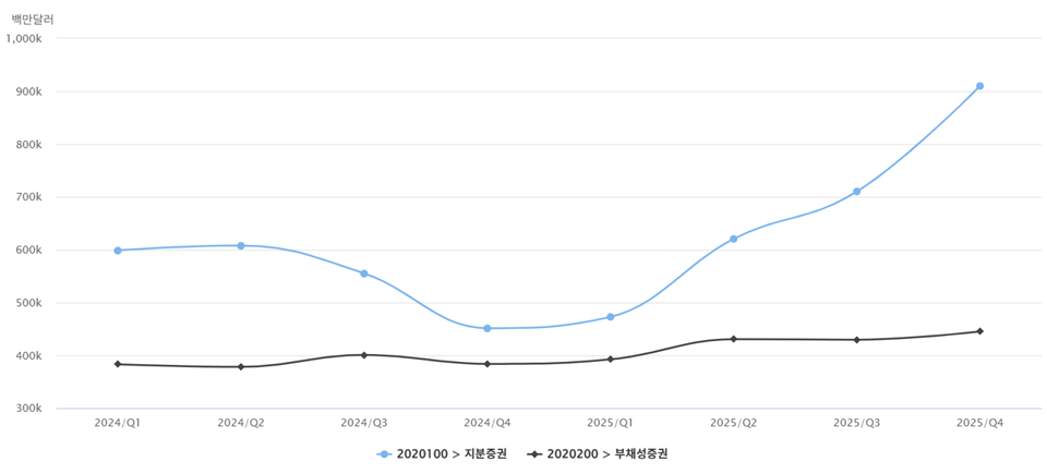 [도표 11] 외국인의 국내 지분증권(주로 주식) 및 부채성증권(주로 채권) 보유액 추이