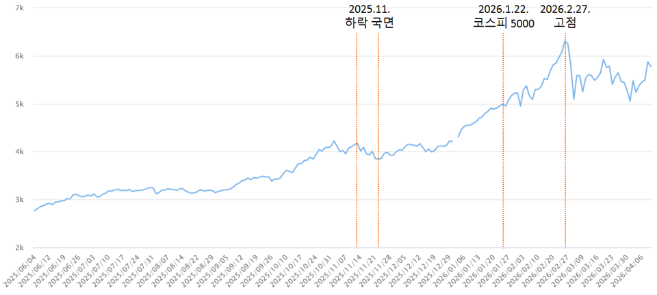 [도표 2] 이재명 정부 출범 이후 코스피 지수 (2025.6.4. ~ 2026.4.10.)