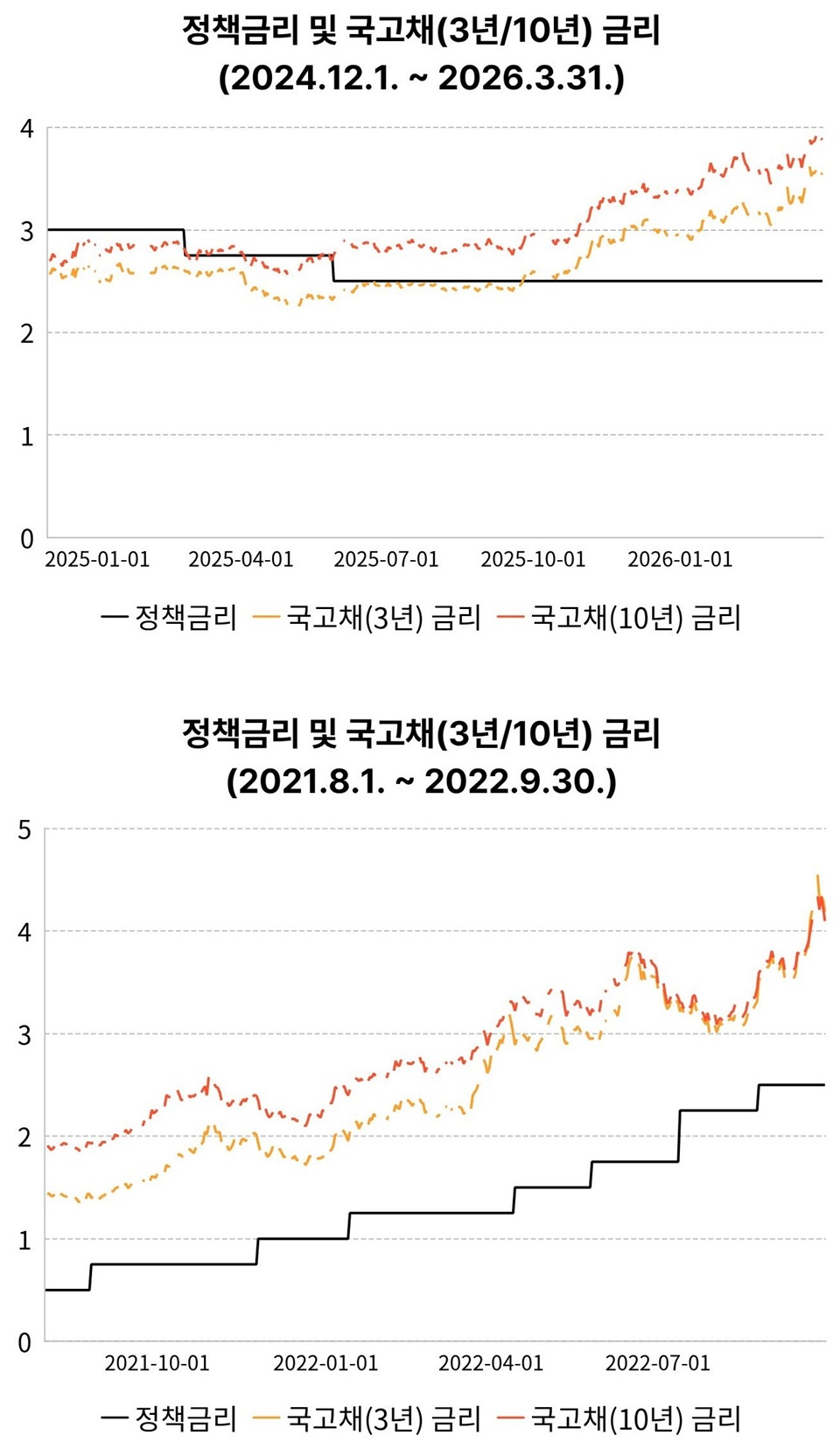 [도표 4] 정책금리와 국고채(3년/10년) 금리 비교: