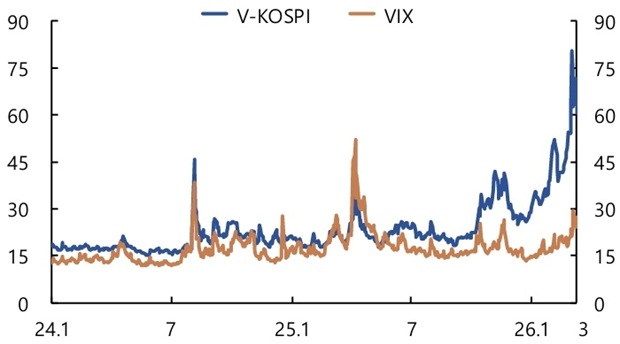 [도표 8] 주가변동성지수: 한국(V-KOSPI)과 미국(VIX)