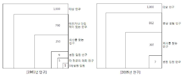 외국에서 이루어진 연구에 따르면, 지역사회에 거주하는 1,000명의 성인 중 1개월 간 약 750명이 아프거나 다치지만, 이 중 의사를 찾는 인구는 1/3인 250명에 지나지 않고, 병원에 입원할 정도로 아픈 사람은 9명, 3차 병원에 입원할 사람은 1명 정도에 불과한 것으로 나타났다. 이와 동일한 방법으로 2005년 일본에서 이루어진 연구에서도 비슷한 결과가 산출되었다(그림 1).