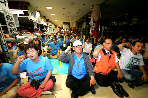 △11일 경찰병력이 홈에버상암점과 뉴코아강남점을 침탈하는 사태가 벌어졌다. 민주노총과 민주노동당 임원들이 현장사수에 나섰다. 사진=이기태기자/노동과세계 이석행 민주노총 위원장이 홈에버상암점 농성현장으로 긴급 출동했다는 소식이다. 상암점에는 연대대오들이 경찰봉쇄를 뚫고 속속 결합하고 있다. 뉴코아강남점 안팎에서 투쟁문화제가 열리고 있다. 봉쇄된 1층 출입구쪽에서 현장사수대와 경력이 몸싸움을 벌이고 있다. 통로를 확보하기 위해서다. 안쪽에서는 무력침탈이 벌어질 경우 발생할 수 있는 다양한 상황에 대해 법전문가가 나와 교육 중이다. 양쪽 각 농성현장에는 수백명씩이 집결해 결의를 다지는 모습이다. [8신대체/19:35]뉴코아강남점+홈에버상암점 일대 투쟁문화제 열려 뉴코아강남점 바깥 집결대오 진격투쟁 중 ▲뉴코아강남점 상황=지하1층 킴스클럽빌딩 사방 출입구는 모두 막혔다. 이 시각 현재 차로와 접한 출입구쪽(한양아파트 맞은 편)에서 몸싸움이 벌어지고 있다. 이날 경찰침탈 긴급소식을 접한 대오들이 투쟁문화제 참가를 위해 달려왔고 이들이 농성장으로 진입하기 위해 경력과 몸싸움을 벌이는 중이다. 강남점 농성현장 지하출입구쪽 내려진 셔터를 사측이 바깥쪽 부분을 용접해놨다. ▲홈에버상암점 상황=농성현장안에서 컵라면과 찬밥 등으로 식사를 치른 농성대오들이 현장 사수 중이다. 이곳 농성장 안쪽 매장진열대와 현장 즉석집회를 벌이는 공간 쪽 전원 2/3가 차단된 상태다. 홈에버상암점은 저녁 10시경 경력이 밀고 들어 올 것이라는 소문이 무성한 가운데 '만일의 사태'에 대비해 임산부 1명을 설득해 내보냈다. 양 농성현장을 지키는 조합원과 연대대오들 모두 표정은 밝고 결연하다. [7신대체/18:30]홈에버상암점 사측이 나서서 '단전'... 전국금속노조 현대자동차지부 '이랜드투쟁' 지지성명 발표 오후4시경 홈에버상암점, 사측이 나서서 전기를 끊었다. 단수가 아닌 단전으로 재확인됐다. 캐셔라인 안쪽 상품매장에는 불이 들어오지만 농성현장쪽만 전기를 끊었다. 사측 사람들은 2층쪽 방화셔터를 모두 내리고 2층에 있던 점주와 고객들을 바깥으로 모두 내보냈다. 한편 여경을 실은 버스가 증강됐다. 경력이 이중으로 현장을 봉쇄했다. 조합원들은 불이 갑자기 나가자 일순 동요하는 표정이었다. 일부는 비명을 지르거나 눈물을 흘리기도 했지만 이 시각 현재 평온을 되찾고 구호를 외치며 투쟁결의를 다지고 있다. 뉴코아강남점은 오후5시경 지하1층 킴스클럽농성장으로 통하는, 닫혀있는 지하출입문을 바깥쪽에서 부수고 뜯는 굉음이 들렸다. 농성대오는 경력진입을 아예 저지한다는 각오로 긴급 대응전 태세로 전환했다. 시시각각 상황이 변하지만 농성대오는 '악질유통자본' 이랜드그룹이야말로 노사갈등 주범이고, 법까지 악용해 노동자 대량해고에만 혈안인 반사회적 기업이라며 끝까지 투쟁하겠다는 각오를 내보이고 있다. 비정규법 악용해 비정규노동자를 대량해고 하고 종교적 의식 강요로 현장 노동자를 통제했으며, 각종 부당노동행위를 일삼은 이랜드그룹 박성수 회장은 끝내 대량해고뿐만 아니라 무력침탈에만 혈안인 것 같다. [6신/17:38] 홈에버상암점 '단수'…2개거점 '고립' 출입이 완전차단된 홈에버상암점 1층 농성현장은 물이 끊겨졌다. 홈에버상암점과 뉴코아강남점 모두 '고립'된 상황이다. [5신대체/17:15] 상암점+강남점, 출입 완전차단돼, 강남점 출입문 부수는 중 상암점과 강남점 모두 출입이 차단됐다. 양쪽 모두 출입구쪽에 차벽을 세워놨다. 농성장에서 나가는 것은 허락되지만 들어가는 것은 전면 차단됐다. 경찰진입에 맞서 사수대가 결사항전했고 오후 5시15분 현재까지 대치 국면이다. 출입구쪽에서는 조합원들이 출입통제에 항의하고 있다. 뉴코아강남점 출입구 경찰진입 저지과정에서 연행됐던 조합원 3명 모두 풀려났다. 오후5시20분 현재 농성장으로 통하는 지하출입구문(본관 지하1층 푸드코트 식당가 통로)을 부수는 소리가 들린다. 조합원들은 동요하지 않고, 반드시 침탈을 저지하겠다는 결의를 다지고 있다. 일제히 저지태세로 전환해 대기 중이다. 민주노총은 이날 저녁 7시 상암점과 강남점 두 곳에서 투쟁문화제를 연다. 수도권 조직들이 2개 거점으로 총집중할 전망이다. [4신/16:24] 월드컵상암점 경력 출입구 침탈 경력이 출입구에 진출했다. 주변 철문을 모두 내리면서 입구를 완전 차단했다. (▲잠시 속보를 중단합니다. 이후 속보 전해드립니다 <편집국>) [3신/16:20]강남점, 경찰 진입시도 중무장한 경력들이 강남점 출입구쪽 진입을 다시 시도하고 있다. 출입구쪽에는 커트를 쌓아 놓았는데 경력들이 문을 강제로 열고 커트를 해체시키는 중이다. 조합원들이 응전 중이다. 이 과정에서 조00, 최00 조합원 2명이 끌려나갔다. 지원이 필요하다. [2신대체/16:05] 뉴코아강남점 경찰진입, 조합원들 모두 농성장안으로 집결 경력이 출입구쪽을 치고 들어와 몸싸움을 벌이고 있다. 경찰은 전경버스를 이용해 출입구 쪽을 다시 봉쇄했다. 출입구에서 대기 중이던 조합원들은 안쪽으로 결집했다. 출입구쪽은 카트 등을 쌓아놓고 경찰진입