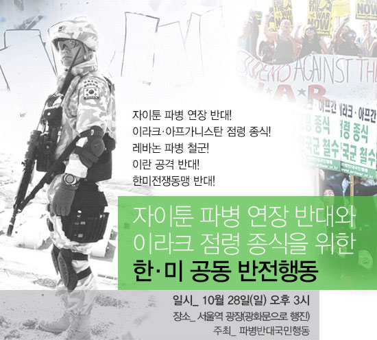 | 자이툰 파병 연장 반대! 이라크, 아프가니스탄 점령 종식 ! 이란공격반대! 한미전쟁동맹 반대! | ||||||||