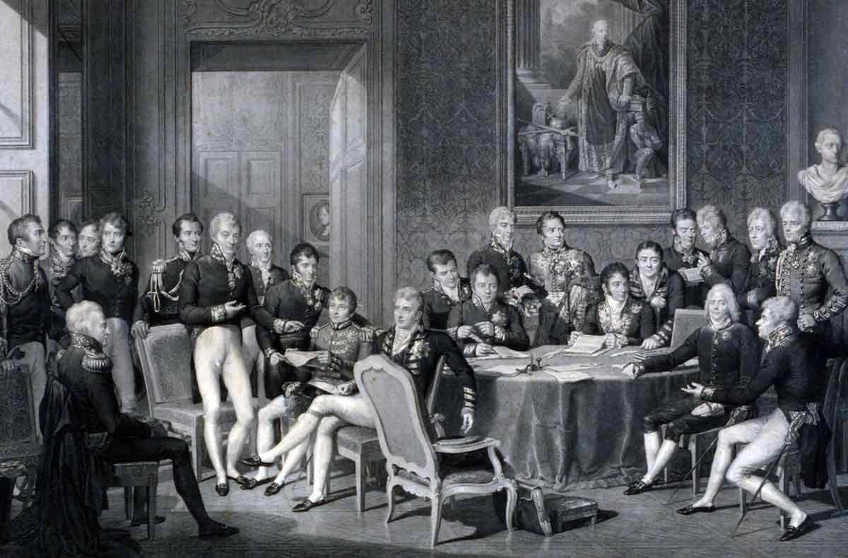 1814~1815년 빈에서 열린 빈 회의(Congress of Vienna)는 군주, 외교관, 예술인을 포함해 다양한 인사들이 모인 행사였다. 사교행사와 무도회가 이어지는 가운데 외교관들 사이의 비공식 협상을 통해 탄생한 것이 1815년 6월 9일 발표된 빈 최종의정서였다. 최종의정서는 바르샤바 공국을 러시아와 프로이센의 세력권으로 분할했다. 스위스를 영세중립국으로 설정했으며, 프랑스를 1792년 혁명전쟁 이전의 영토로 고정했다. 이밖에 항행의 자유와 외교관 등급 체계를 비롯해 강대국 간 외교 규칙을 정했다. (출처: 위키피디아)