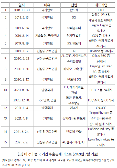 바이든 행정부 역시 2021년 4월 출범 이후 발표한 첫 수출통제리스트에 중국의 슈퍼컴퓨터 회사 7개를 포함한 데 이어, 2022년 10월에는 중국의 반도체 기업에 첨단반도체 장비 판매를 금지하고 AI와 슈퍼컴퓨터에 사용되는 반도체에 대한 수출을 제한하는 새로운 수출통제 조치를 발표했다. 이 조치는 먼저 미국 기업이 특정 수준 이상 반도체를 생산하는 중국 기업에 첨단반도체 제조 장비를 판매할 경우 별도의 허가를 받도록 했다. 특히 중국 내 생산시설을 중국 기업이 소유한 경우 ‘거부 추정 원칙’을 적용해 수출이 사실상 금지되었다.
